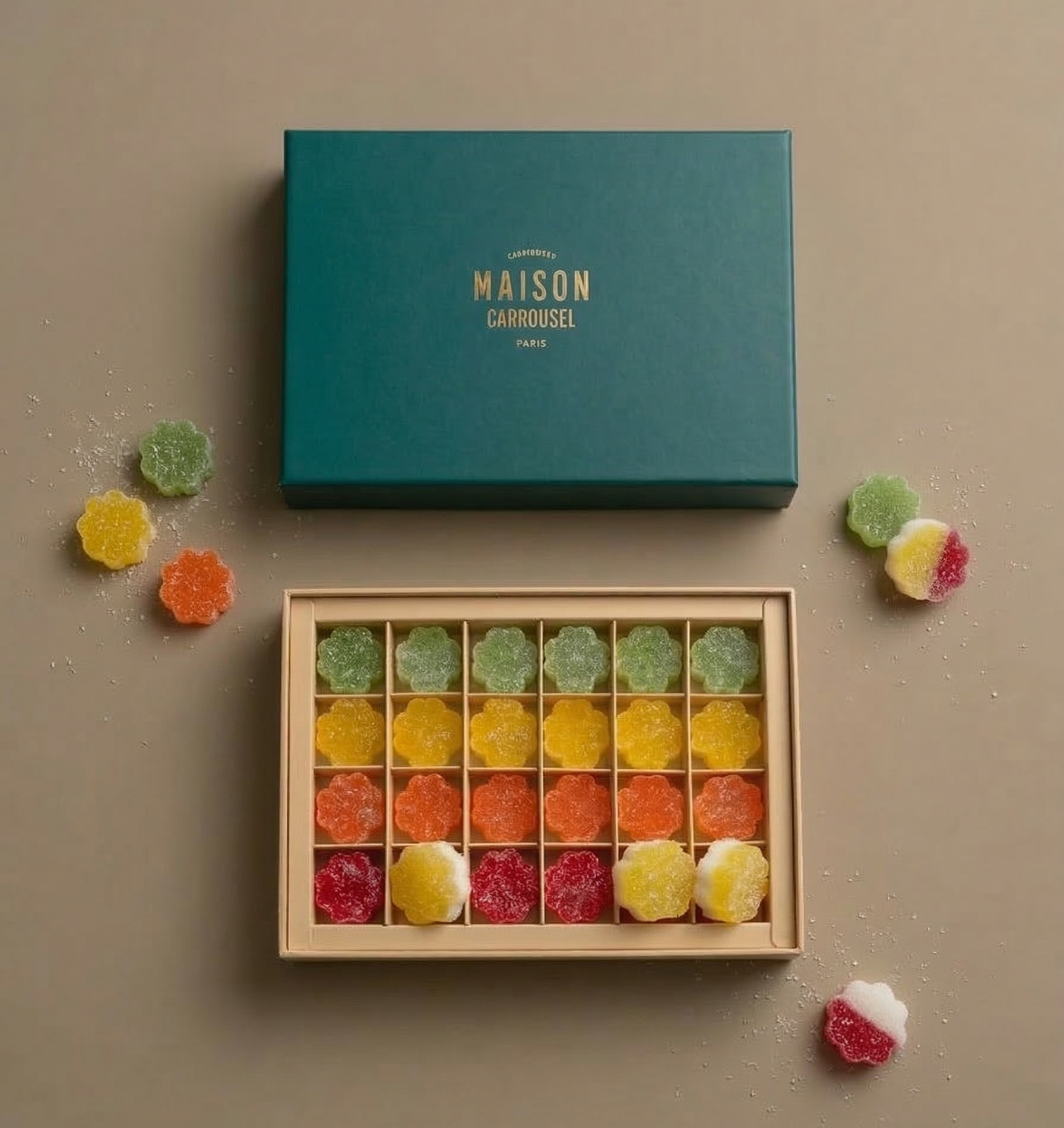 Le coffret de bonbons artisanaux s'inspire des pâtes de fruits traditionnelles, revisitées dans une version plus contemporaine. L’objectif est de retrouver la gourmandise de la confiserie classique tout en apportant davantage de fraîcheur et de légèreté.